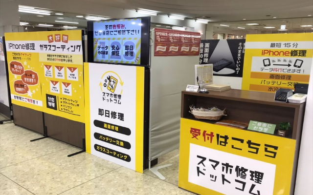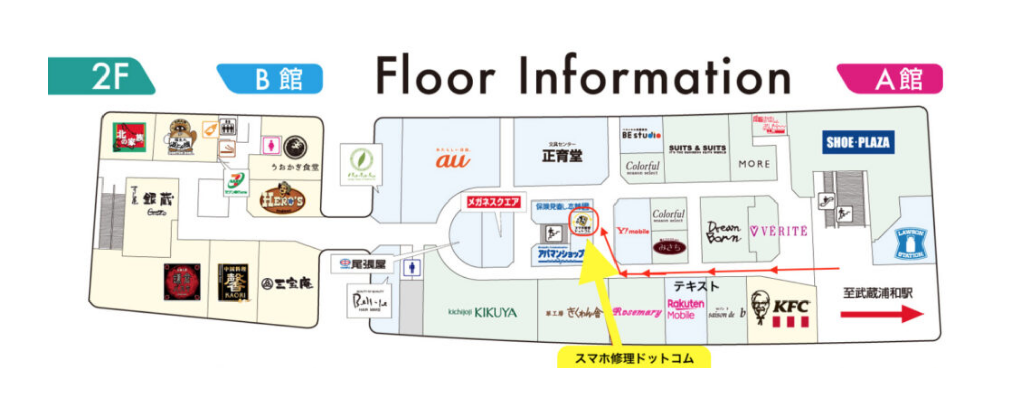 入口から入り右手にY!mobile(ワイモバイル)さん目の前/行政相談窓口の隣に当店がございます。
