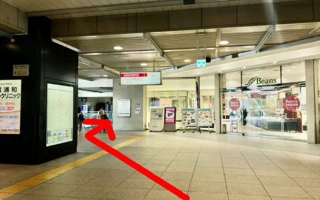 JR武蔵浦和駅改札出て矢印の方向に向かってください。Beans(ビーンズ)さんの隣の通路に向かってください。