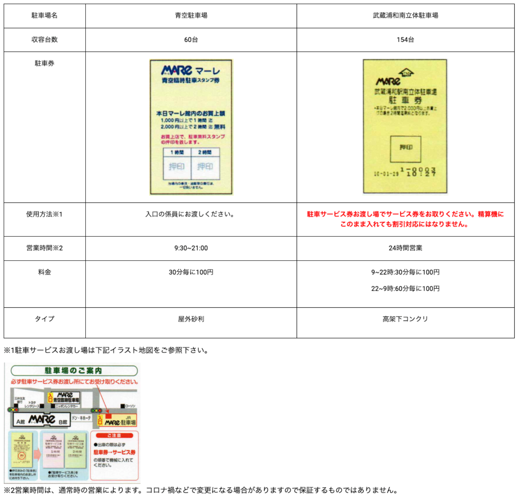 マーレ青空駐車場と武蔵浦和南立体駐車場です。修理した方は2時間無料になりますので受付時もしくはお会計時にスタッフまで駐車券をご提示ください。